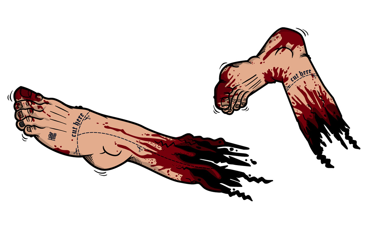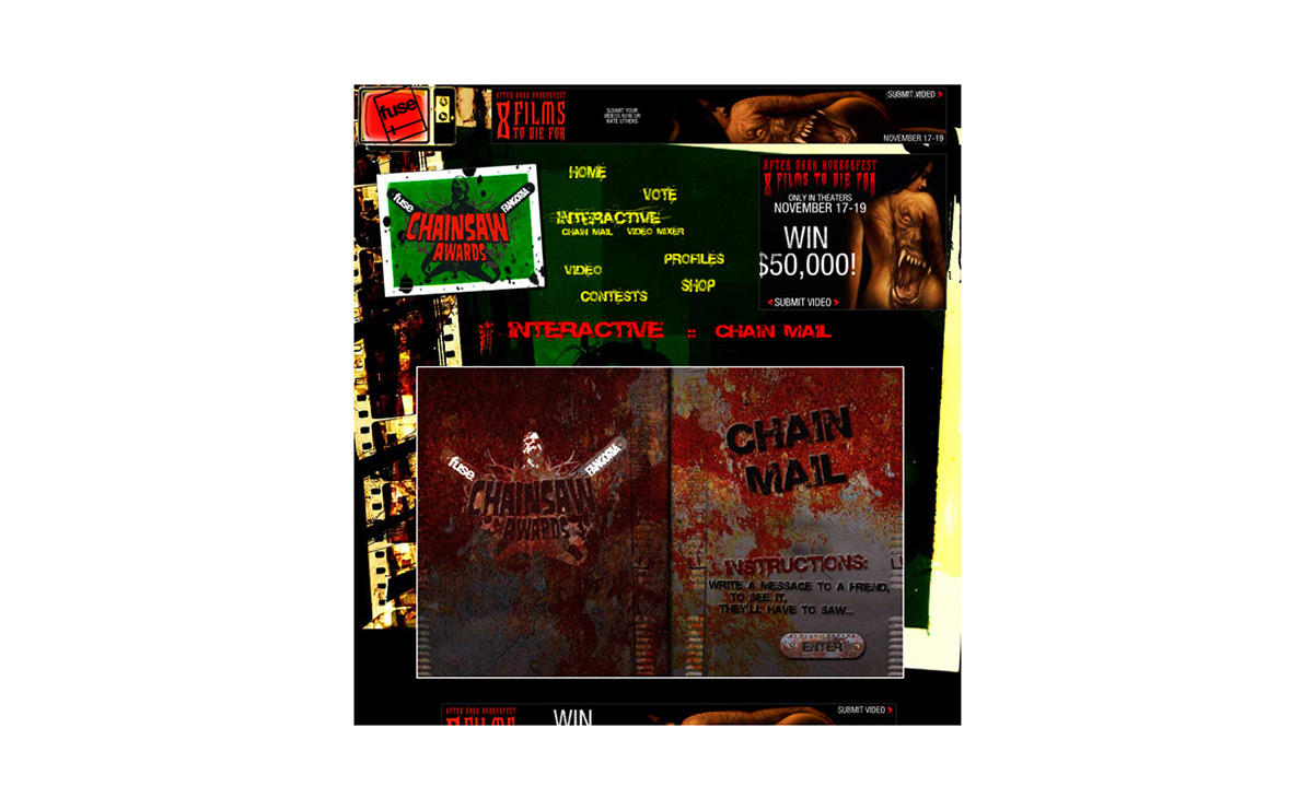 Fangoria Magazine’s Annual Chainsaw horror movie awards needed interactive content to cross promote their show. Pod Design developed an instant messenger / game for Fuse TV’s website and I was hired to illustrate body parts and blood splatters used as the decoder. Users on the site retrieved their messages from one another by throwing severed body parts at a wall that splattered to reveal a hidden messages.