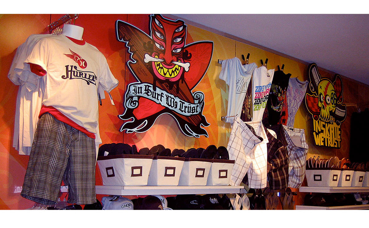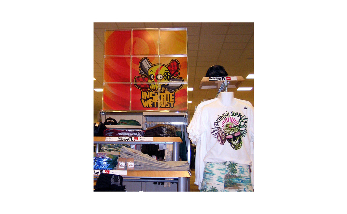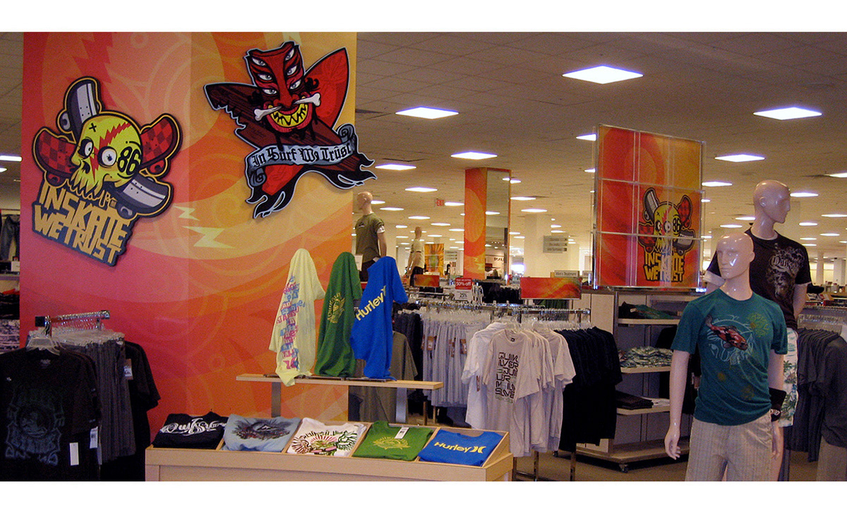 “In Skate/Surf We Trust” project was developed to drive sales in the Young Men’s Action Sports Department at Macy’s. The graphic package was distributed to 20 store locations across Florida and Puerto Rico where the surf and skate demographic penetrated 75% of the market. Shown above are some of the graphics installed and alternatives to the final designs created.